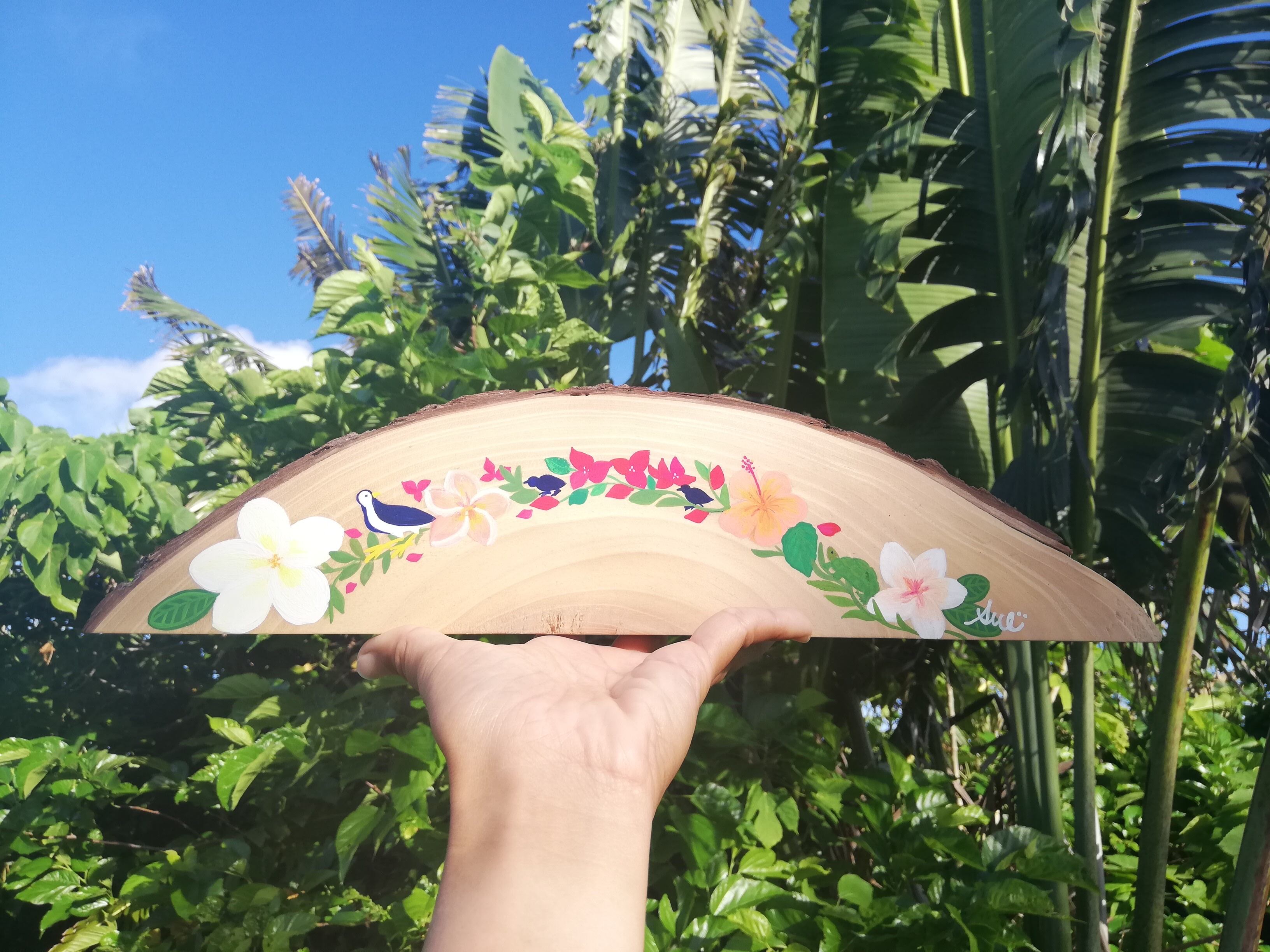 こちらの原画は、石垣島のKATARIGIさんで見つけた 石垣島産のヤラブ(テリハボク)の端材に描いたものです。